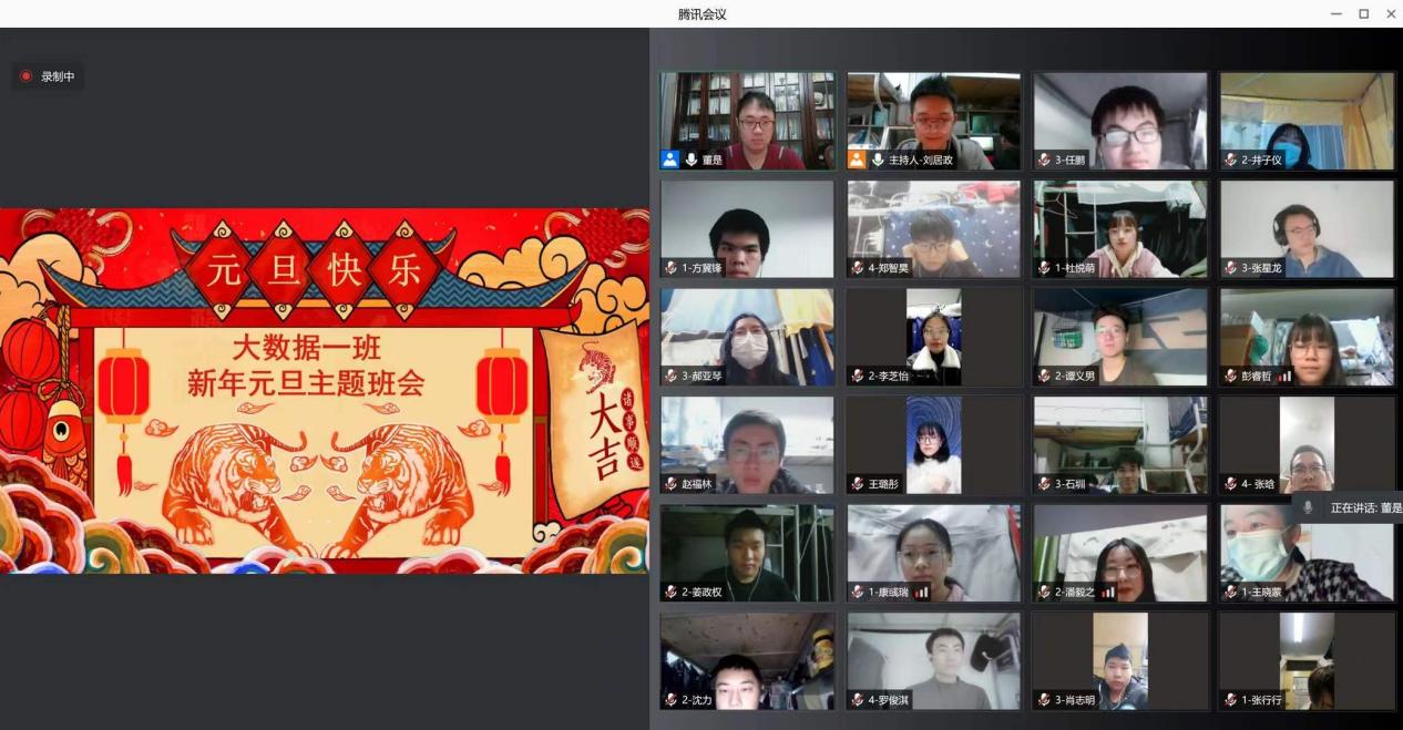2021年末,疫情的突然到来打破了原本宁静的校园生活,大部分同学在宿舍隔离,还有一部分同学在酒店集中隔离,为了安抚和鼓励同学们更好的学习和生活,2022年1月3日晚,在大数据所董是老师和党英老师的组织下,hg8868皇冠登录入口2020级大数据管理与应用一班“共抗疫,迎新年”主题班会在腾讯会议上举行。班长刘居政和团支书彭睿哲担任主持人。