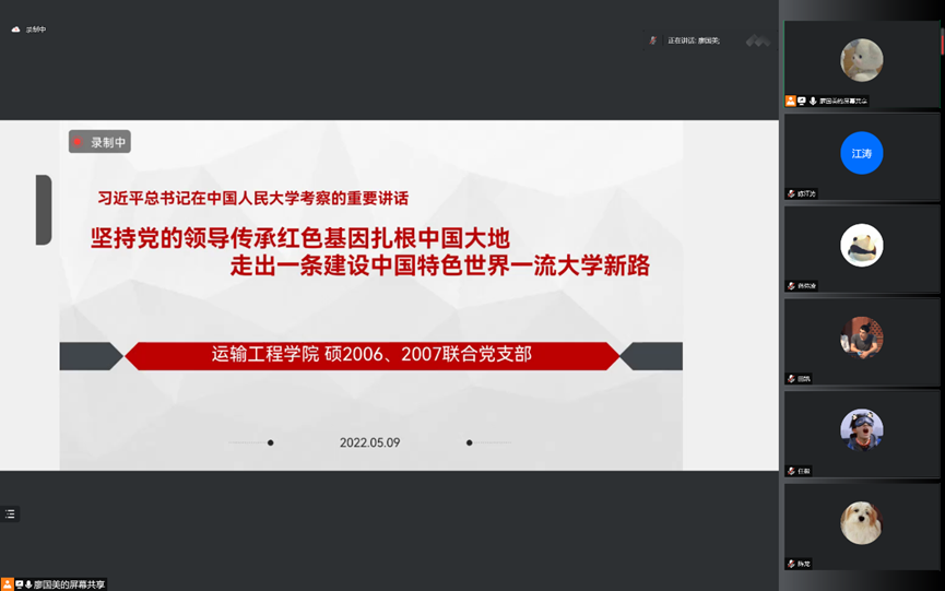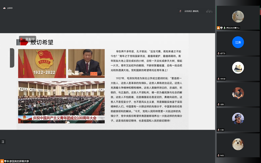 为了深入学习领会习近平总书记在中国人民大学考察时的重要讲话和在五四青年节建团100周年大会上习近平总书记的讲话,激励青年在青春的赛道上奋力奔跑,硕2006、2007联合党支部于2022年5月9日中午以腾讯会议的形式线上召开了支部学习交流会。会议由副书记廖国美同志主持,支部党员、积极分子和入党申请人参加了会议。