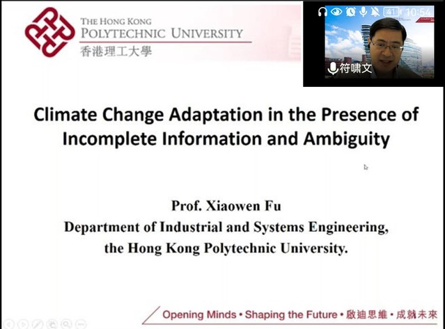2022年6月23日上午10:30,香港理工大学符啸文教授受邀以线上方式为我院师生作了一场精彩、生动、有趣的学术报告。他的报告题目为:不完备信息和模糊情形下大气变化的适应(Climate Change Adaptation in the Presence of Incomplete Information and Ambiguity),我院百余位师生聆听了此次报告。