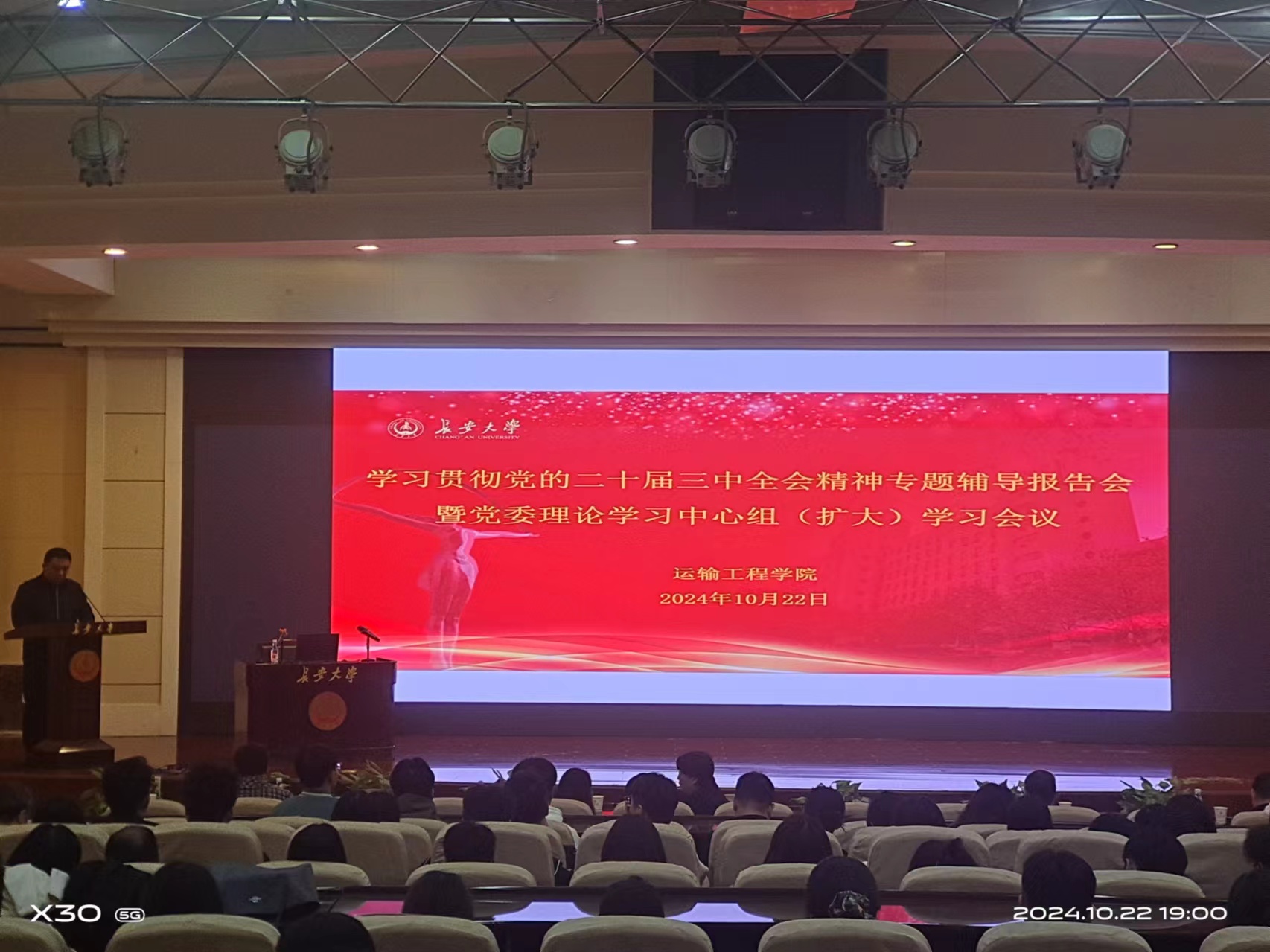 为深入学习贯彻党的二十届三中全会精神,10月22日晚,学院在南校区北院学术交流中心报告厅举行学习贯彻党的二十届三中全会精神专题辅导报告会暨党委理论学习中心组(扩大)学习会议。会议邀请hg8868皇冠登录入口马克思主义学院姜建芳教授作党的二十届三中全会精神专题辅导报告,学院党委书记史少鹏主持会议,党委委员、全体教职工、全体研究生党员参加会议。